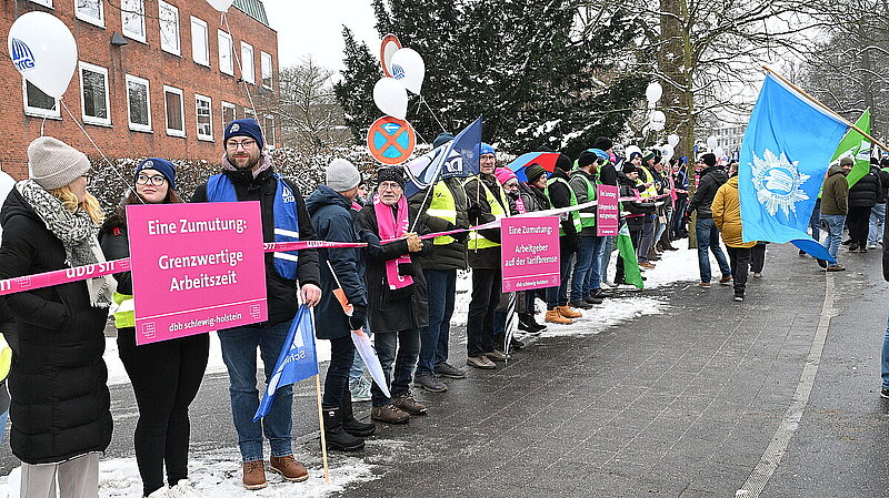 Mit einer Menschenkette aus 600 Leuten haben die Beschäftigten des öffentlichen Dienstes in Kiel für höhere Einkommen und bessere Arbeitsbedingungen demonstriert.