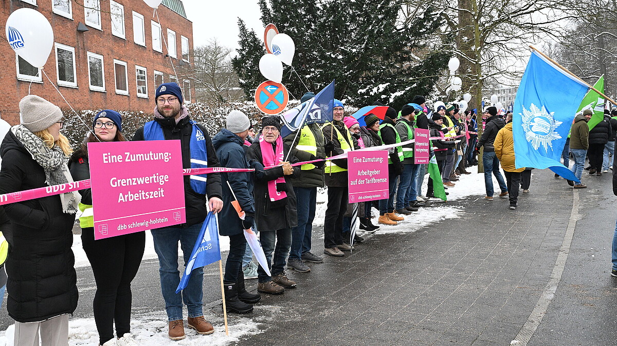„Wir zeigen heute deutlich: Der öffentliche Dienst hält zusammen. Wir lassen uns nicht gegeneinander ausspielen, die Argumente der Politik sind längst abgewetzt“, betonte Kai Tellkamp, Landesbundvorsitzender des dbb schleswig-holstein, am 6. Januar 2026 auf der Kundgebung in Kiel. Zuvor hatten die Beschäftigten eine Menschenkette zwischen dem Finanzministerium und Staatskanzlei gebildet. „Ob in unseren Landesbehörden, in unseren Schulen, im Straßenbetriebsdienst oder bei der Polizei: Die Beschäftigten des öffentlichen Dienstes halten das Land am Laufen – auch bei Eis und Schnee. Da ist es doch nicht zu viel verlangt, dass die Tarifgemeinschaft deutscher Länder auch mal Einsatz zeigt, und endlich ein angemessenes Angebot vorlegt“, so Tellkamp. Die Beschäftigten fordern sieben Prozent mehr Einkommen, mindestens aber 300 Euro mehr.